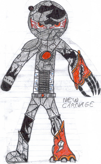 __Meanwhile. In the sewers of Haven City an evil was awaken. Carnage recovered by commanding the sentinels to create a cybernetic body for him if something in his master plan went wrong. carnage's new appearance was frightening at first glance. His head was covered with patches of shrapmetal, and he had a targeting camera on the upper right side of his head. his entire body, except for half of his legs and half of his left arm, was replaced with metal coated with titanium, making it indestructible. His right hand was a huge crab like hand, only with fingers instead of claws. His right leg from the knee down was similar to his massive hand. his heart was covered with a circular thermal projector making an indestructible shield over his heart. He had simple objectives. First, enialate the 501st, then kidnap Michaela and hold her for ransom, or challenge Micheal to face him. Third, kill Micheal and Michaela. If Mark gets in his way like he did last time he would kill him as well. He has his plan, now all he has to do is wait for the perfect time to strike. Finally he would have his revenge on the 501st and will take over Haven City. Soon Micheal will finally see Carnage as a threat. He laughed at this thought. Carnage knows if the oracle interferes with his plan, he will surely fail, but he has to try.